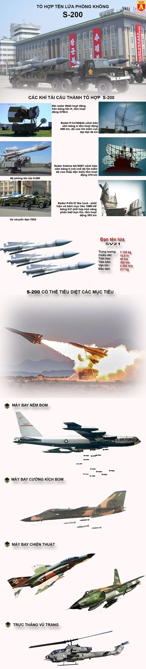 Với 4 tiểu đoàn tên lửa S-200, Triều Tiên hoàn toàn có thể khiến máy bay Mỹ - Hàn "một đi không trở lại". Hệ thống tên lửa phòng không S-200 do Liên Xô phát triển từ những năm 1960 được thiết kế nhằm bảo vệ các mục tiêu chiến lược khỏi máy bay ném bom tầm xa, tầm cao của Mỹ và Phương Tây. Trước khi có S-400, S-200 là tên lửa phòng không đạt tầm bắn xa nhất thế giới, vượt xa cả tầm bắn của S-300.