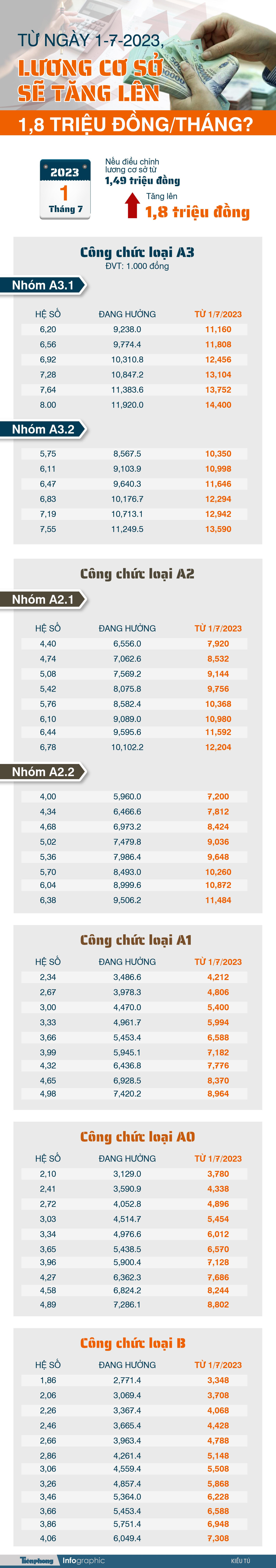 TPO - Hiện Chính phủ đang trình Quốc hội điều chỉnh mức lương cơ sở, thực hiện tăng lương cơ sở cho cán bộ, công chức, viên chức lên mức 1,8 triệu đồng/tháng (tăng khoảng 20,8%), áp dụng từ 1/7/2023. Nếu mức lương này được áp dụng thì sẽ có nhiều thay đổi.