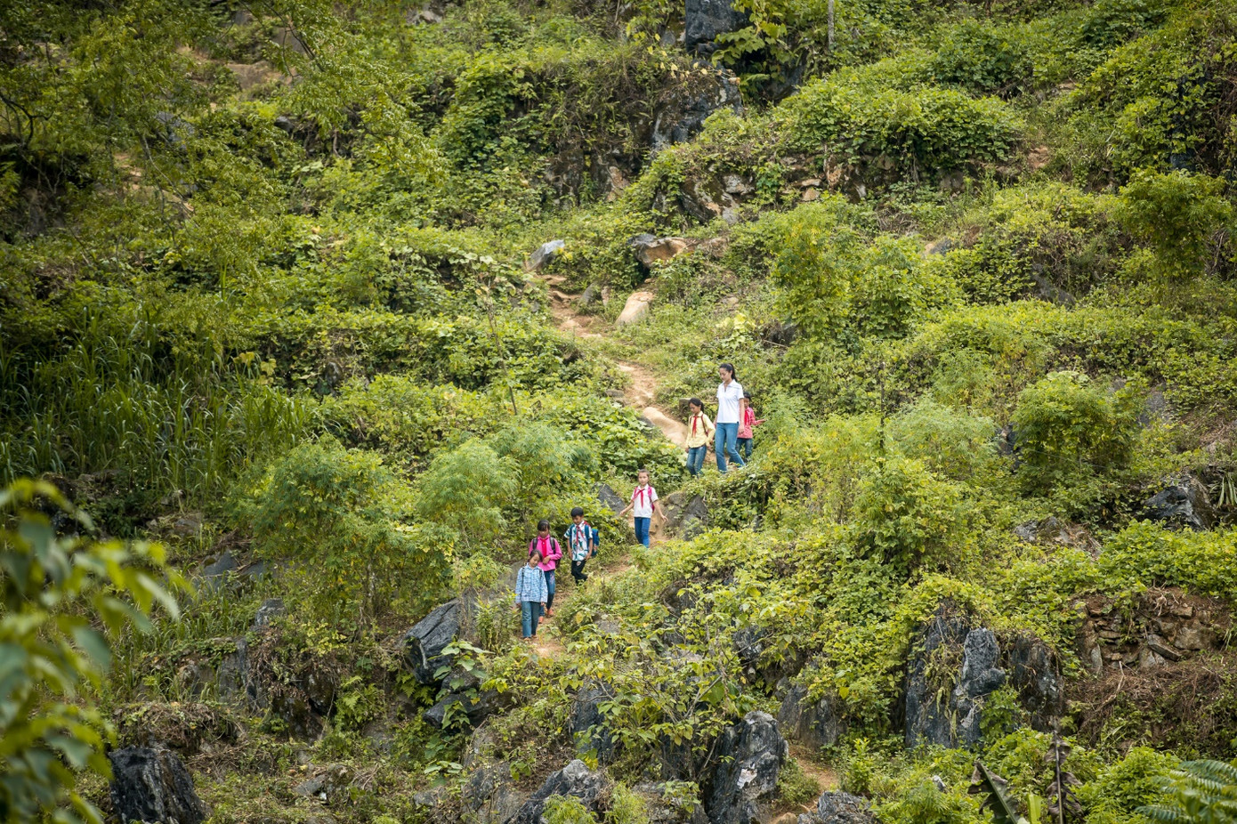 Như đã chia sẻ, để lên được điểm trường của Lũng Lìu, Linh và ekip phải leo ngọn núi tương đương gần 100 tầng lầu, con số cũng khá choáng đấy ạ. Con đường không xa nhưng dốc và khó đi, có những nơi dốc dựng 50 độ đi rất mất sức.