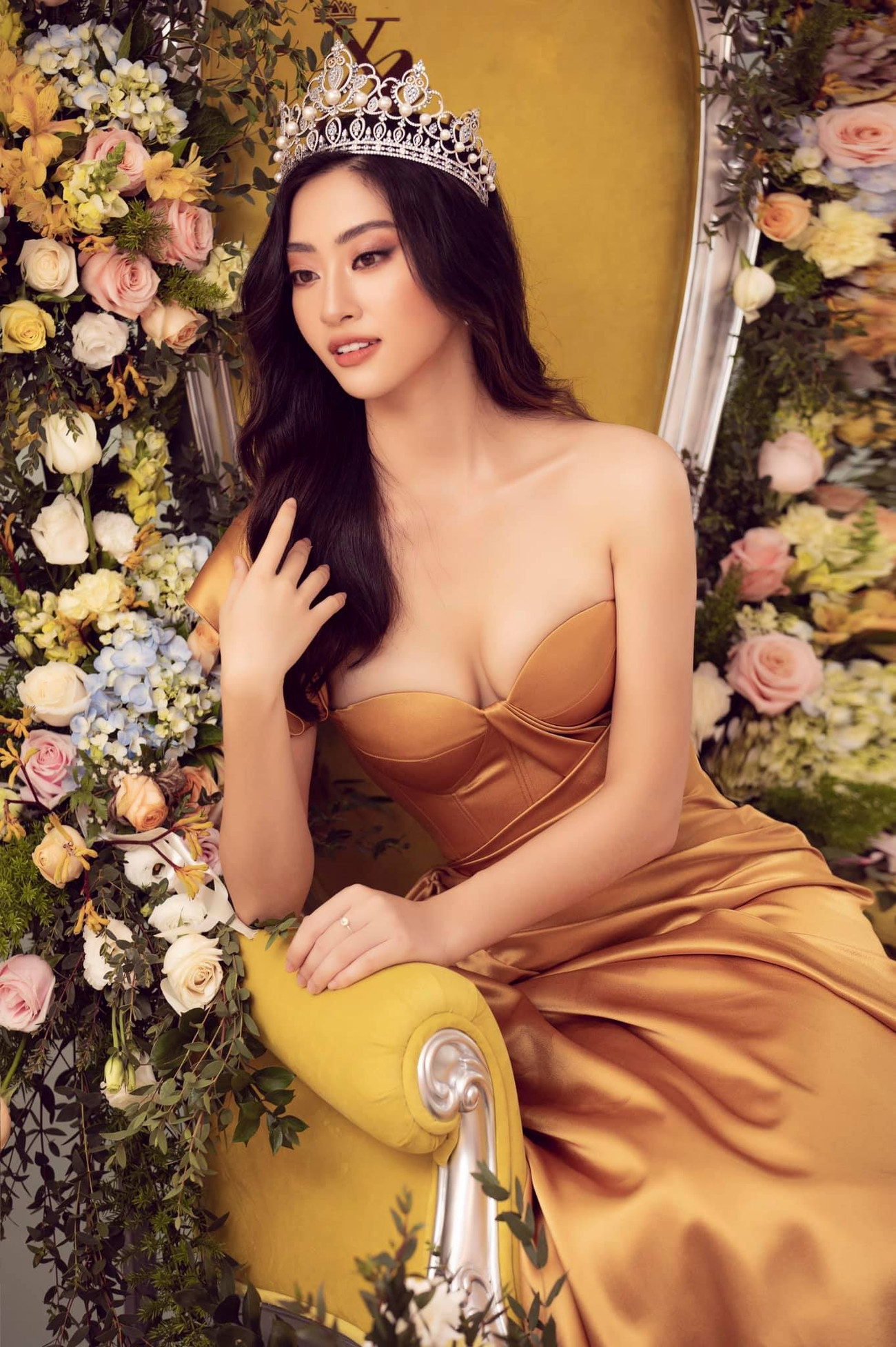 Hoa hậu Lương Thùy Linh nổi bật trong bộ váy lụa màu vàng.