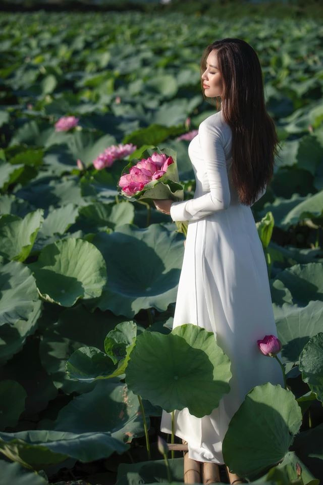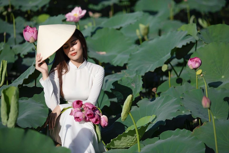 Người đẹp Biển Nguyễn Thị Loan dịu dàng với áo dài trắng, nón lá bên hồ sen Hồ Tây.