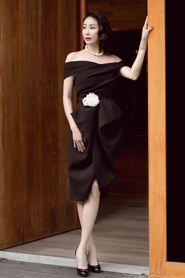 Hoa hậu Hà Kiều Anh khoe vẻ đẹp cổ điển, đài các với bộ váy khoe vai trần màu đen.