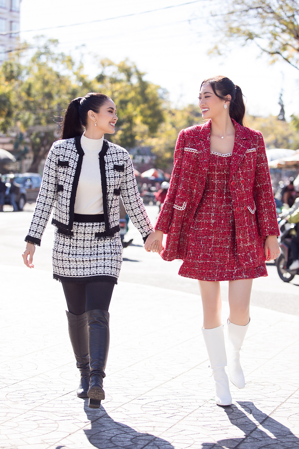Thức dậy từ sáng sớm, Megan Young và Lương Thuỳ Linh đã cùng nhau diện trang phục đồng điệu và phù hợp với tiết trời Đà Lạt để có thể hoạt động hiệu quả nhất.
