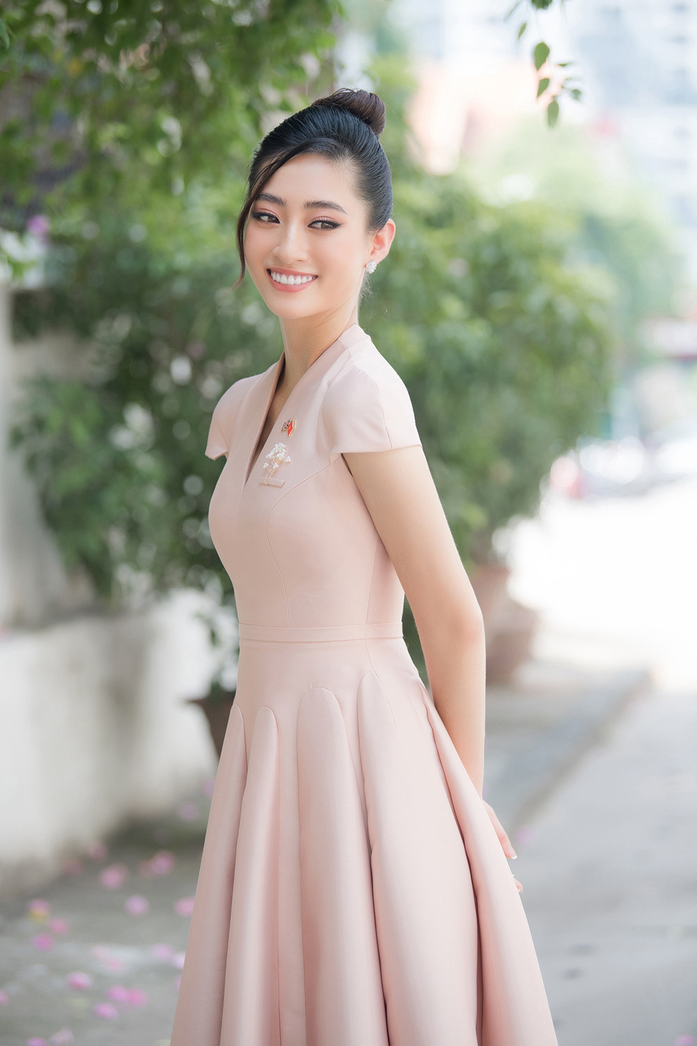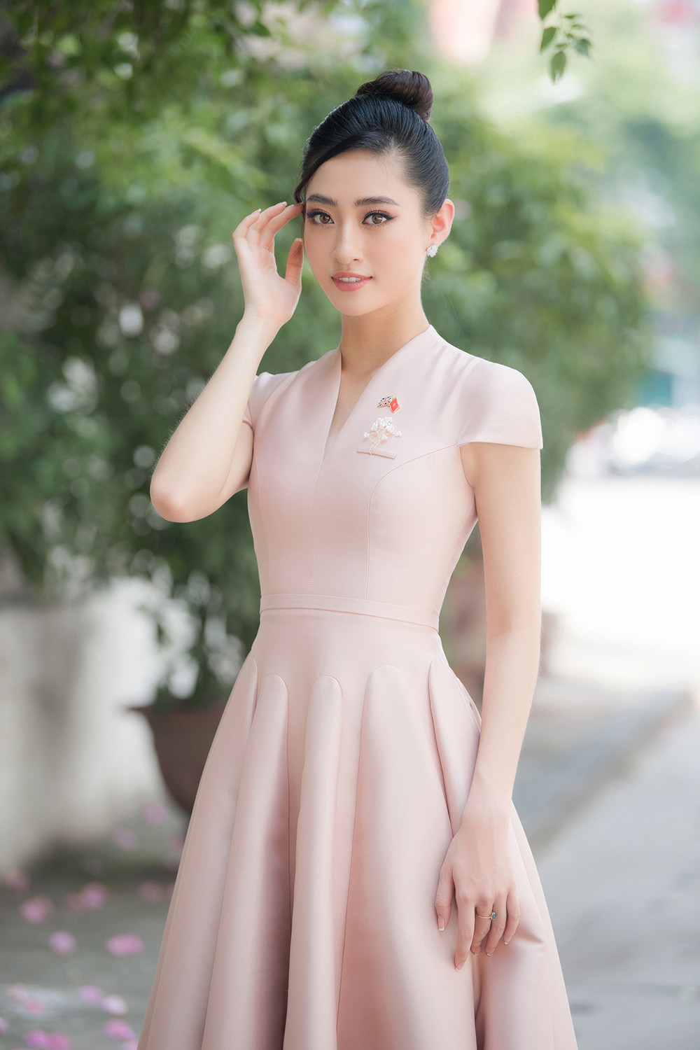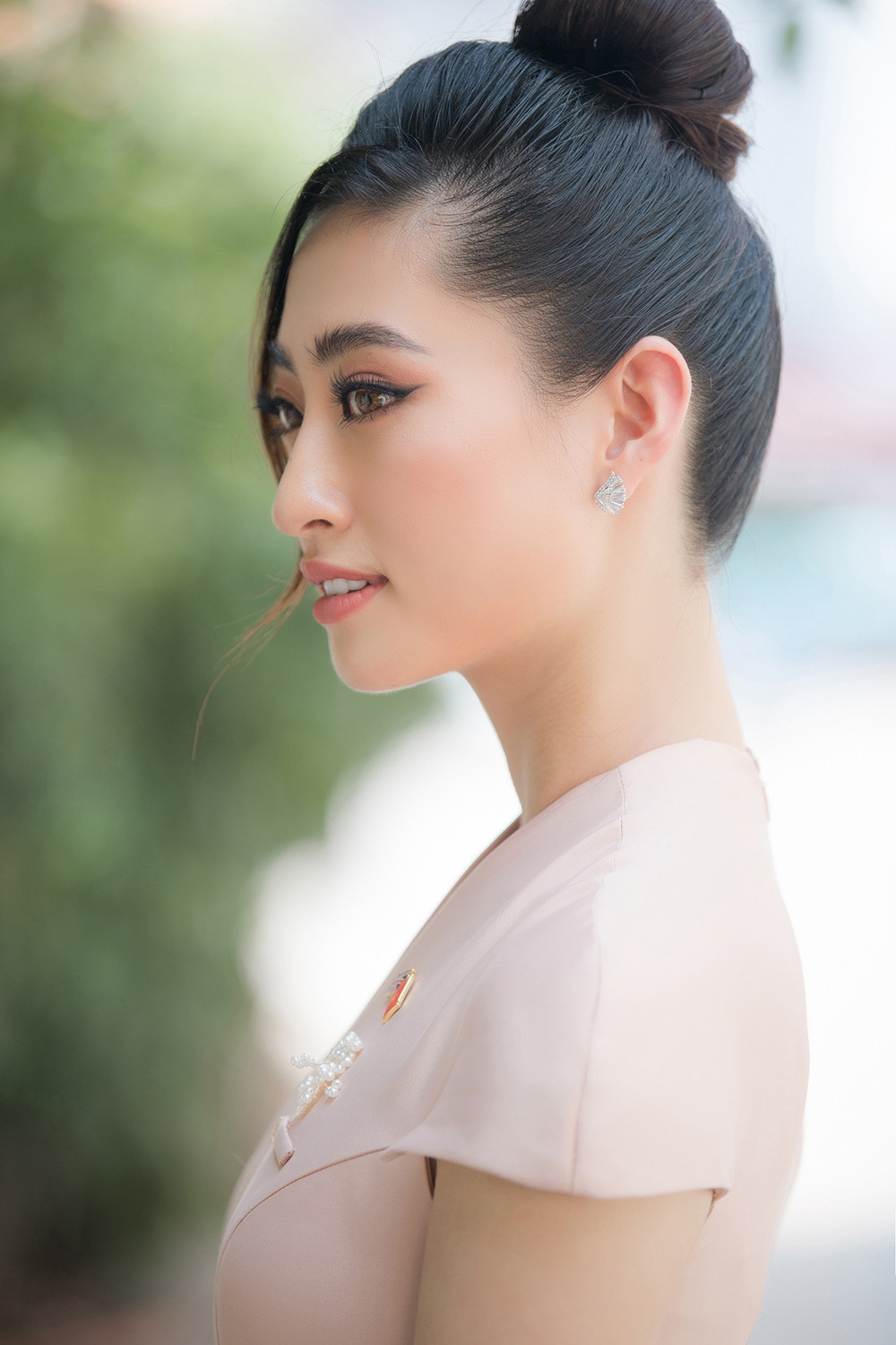 Nàng hậu sinh năm 2000 lựa chọn kiểu búi tóc cao quý phải và tông trang điểm màu hồng nhạt nhẹ nhàng.