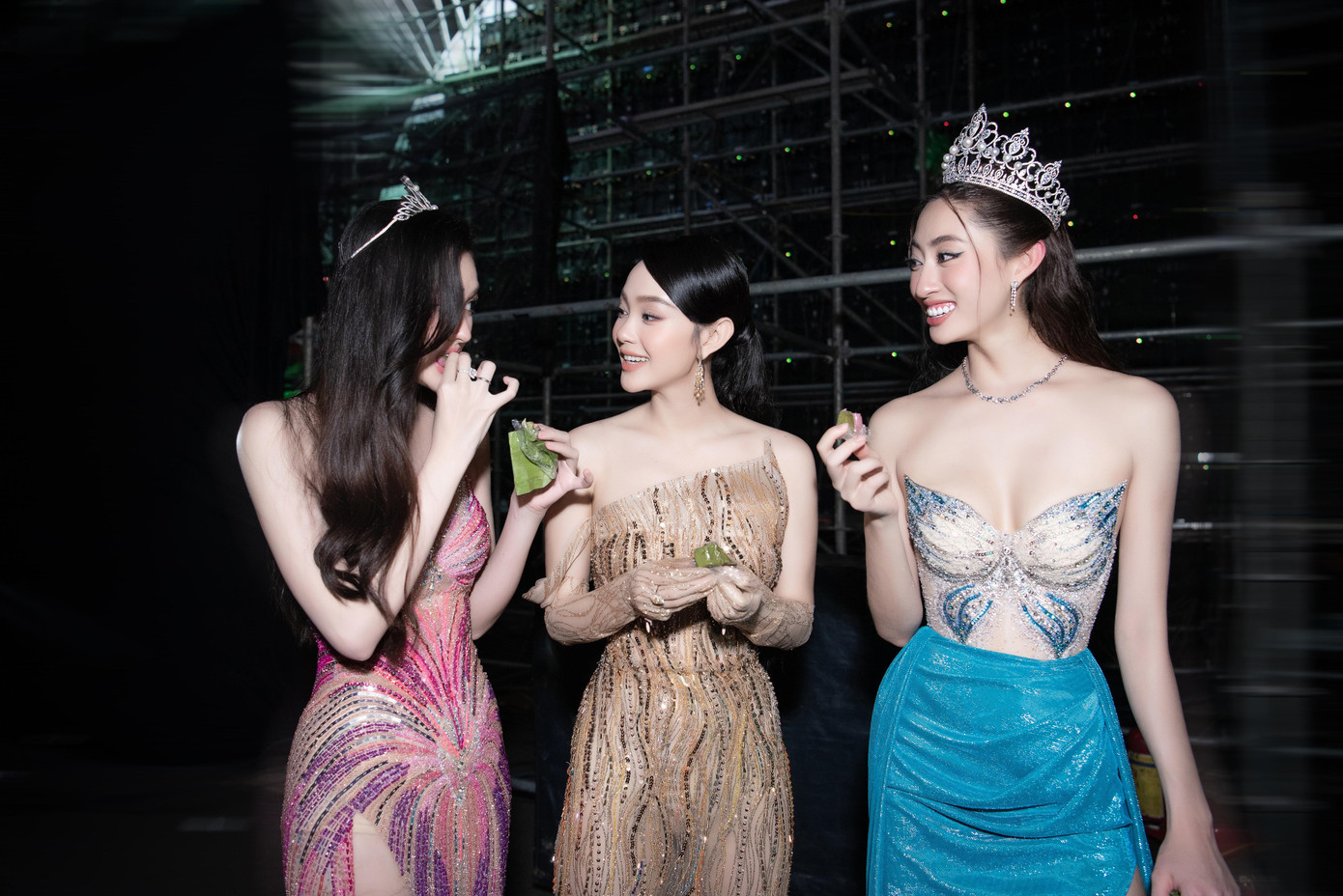 | Minh Hằng hội ngộ Hoa hậu Lương Thùy Linh và Á hậu Tường San trong hậu trường. |