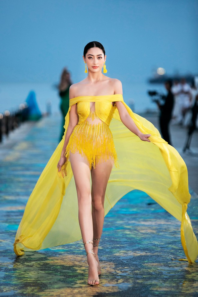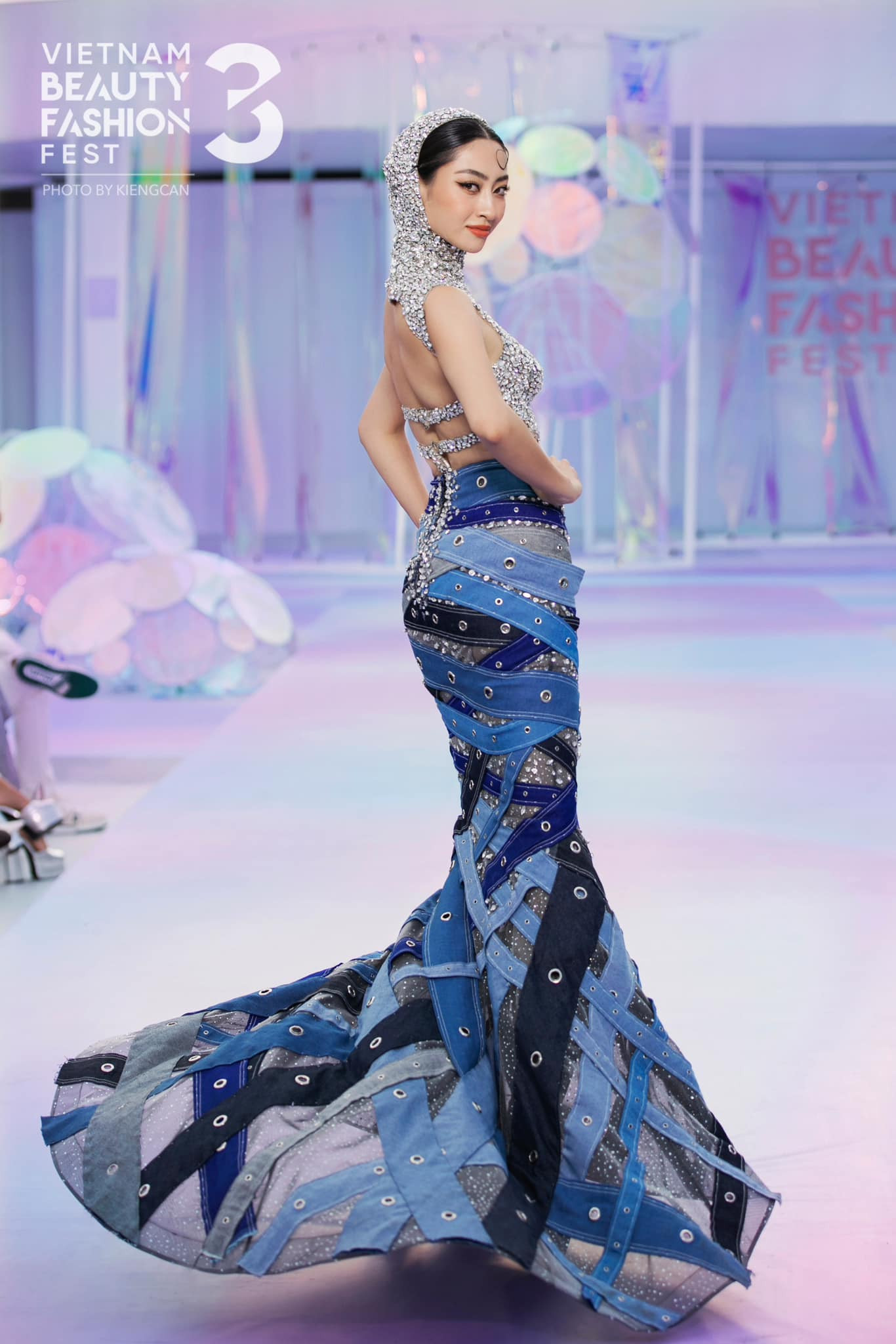 Những bước catwalk chắc chắn của nàng hậu giúp phần trình diễn thêm cuốn hút. Đặc biệt, màn xử lý chiếc váy khó nhằn bằng một cú đá chân dứt khoát cùng thần thái ngút ngàn ở cuối sàn runway của Lương Thuỳ Linh đã nhận về "cơn mưa lời khen".
