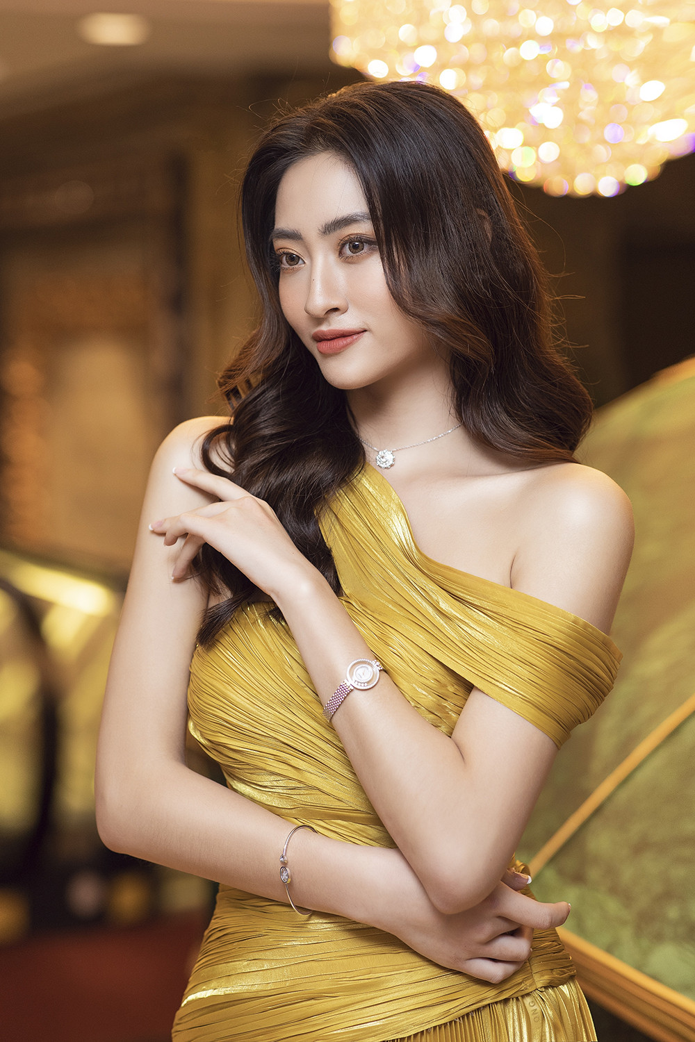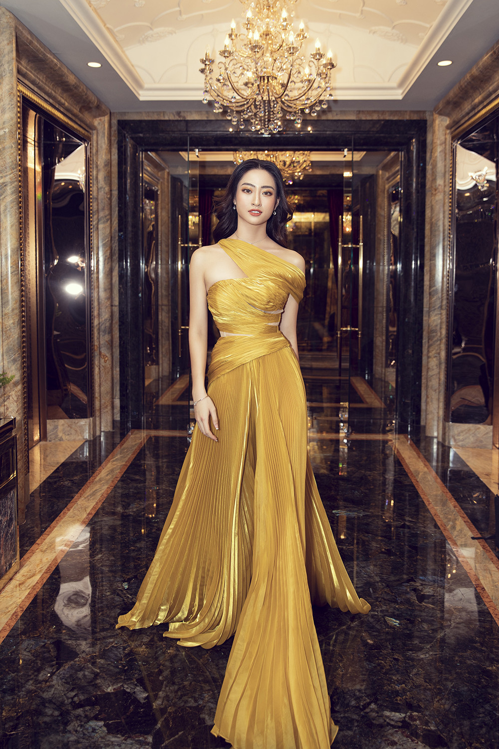 Lương Thuỳ Linh khéo léo khoe nhan sắc rực rỡ của mình giữa không gian sự kiện với bộ đầm dạ hội xếp ly màu vàng, khoe đôi chân dài 1m22 quyến rũ.