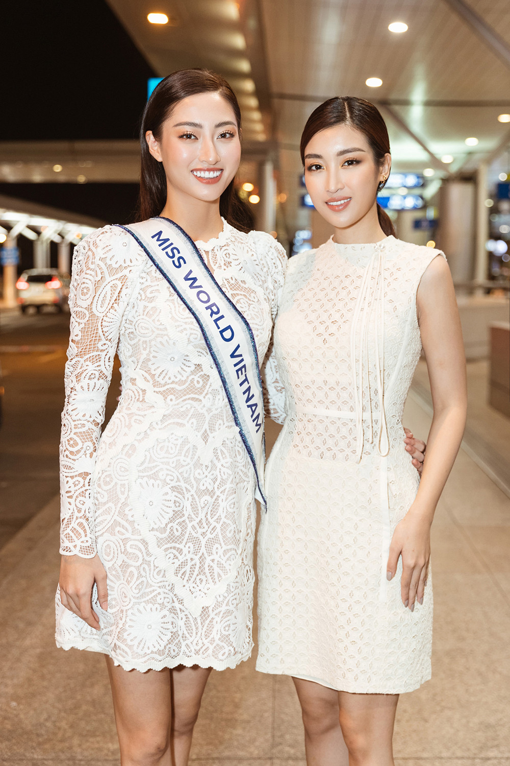 Bà Phạm Kim Dung - trưởng BTC cuộc thi Miss World VIetnam 2019 cùng dàn hậu xinh đẹp Đỗ Mỹ Linh, Tiểu Vy, Phương Nga, Kiều Loan và đông đảo các người đẹp tới từ Miss World- Việt Nam cũng đã có mặt tiễn Lương Thuỳ Linh. Sự xuất hiện của dàn hậu “khủng” đã khiến sân bay “náo loạn”.