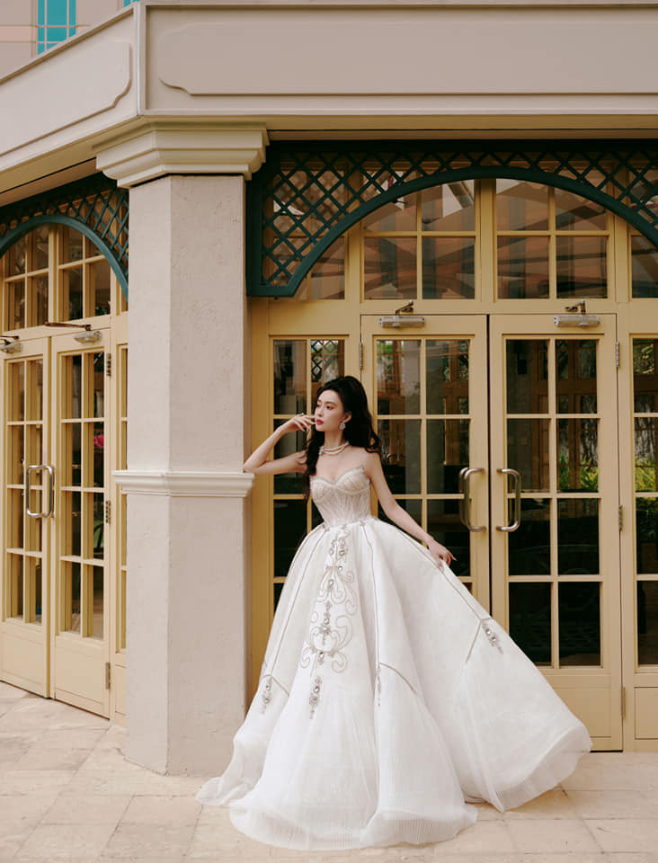 Sau đó, nữ diễn viên tiếp tục gây "sốc visual" với thiết kế trắng kem, phần cúp ngực đính đá cầu kỳ trong sự kiện chính.