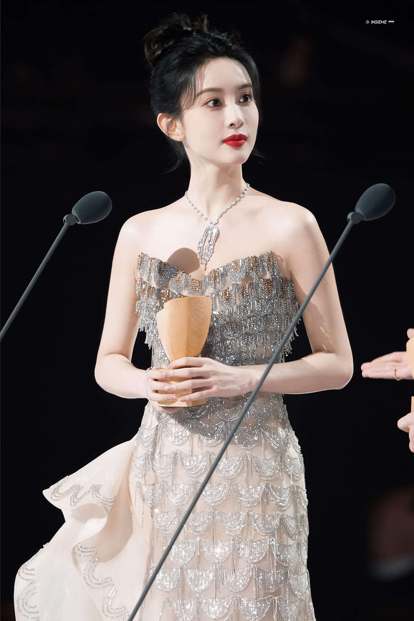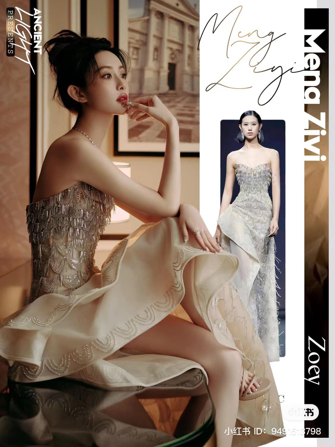 Nữ diễn viên Mạnh Tử Nghĩa xuất hiện tại Tinh Quang Đại Thưởng 2023 tối 17/12 với hai thiết kế đầm của nhà mốtHacchic Couture. Nàng Hoa khôi Bắc Ảnh đẹp lộng lẫy với thiết kế váy cưới cúp ngực màu trắng của trên thảm đỏ.
