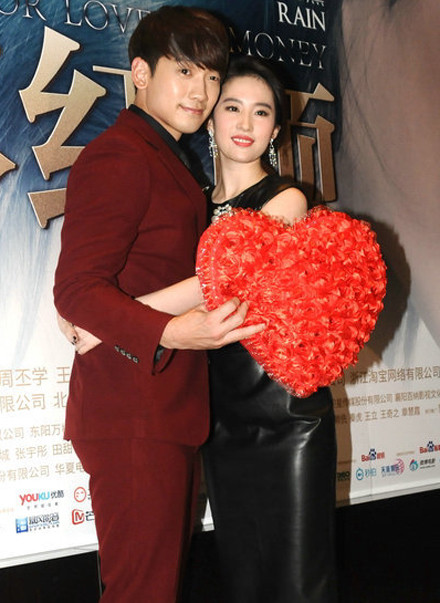 Lưu Diệc Phi và Rain tại một buổi họp báo.