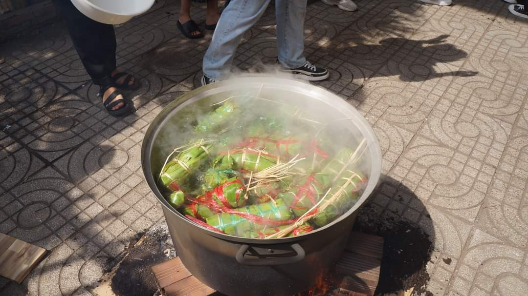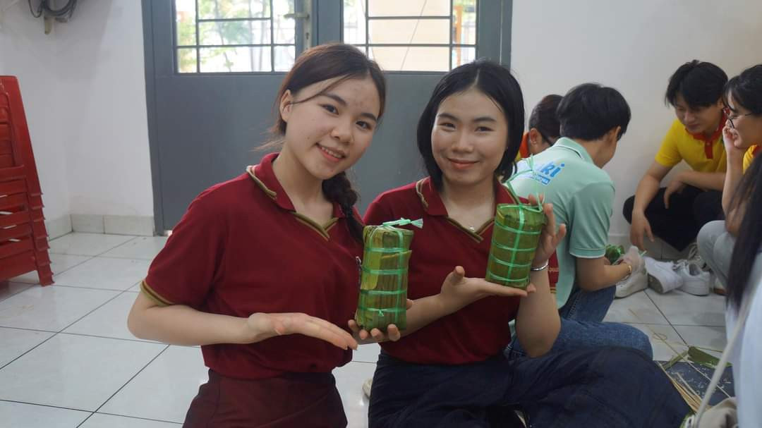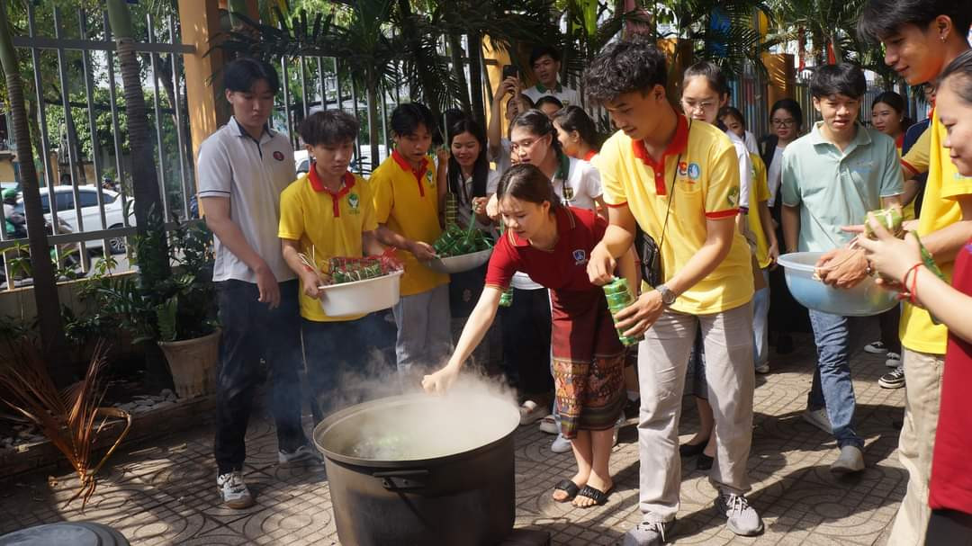 | Các lưu học sinh Lào, Campuchia cùng tham gia gói bánh tét. |