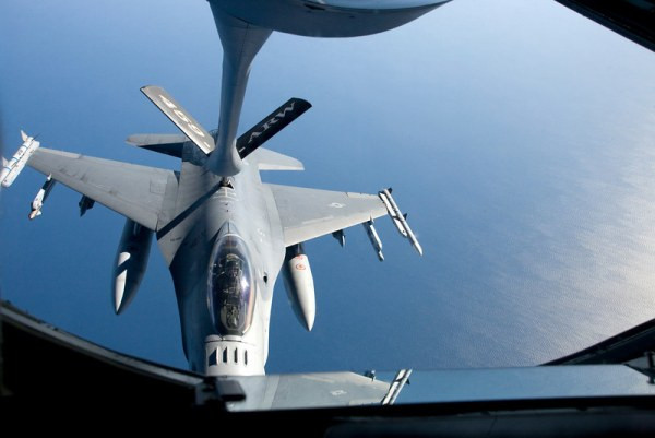 Các máy bay chiến đấu của Không quân Mỹ hộ tống máy bay của tổng thống, sẵn sàng can thiệp nếu máy bay không được phép nào đó đến quá gần. Trong ảnh là chiếc F-16 Fighting Falcon thuộc Phi đội máy bay chiến đấu 121 và chiếc KC-135 Stratotanker thuộc Đội tiếp nhiên liệu trên không 459