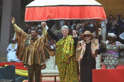 Trong chuyến thăm đến 6 nước châu Phi của Tổng thống Bill Clinton và Phu nhân năm 1998, quân đội Mỹ thực hiện 98 cuộc vận chuyển bằng máy bay để đưa các thiết bị và phương tiện cá nhân phục vụ chuyến thăm, đồng thời lập các đơn vị sơ tán y tế tạm thời tại 5 nước. Trong ảnh là Tổng thống Clinton và Phu nhân cùng Tổng thống Ghana hồi đó, ông Jerry Rawlings, trong chuyến thăm cấp nhà nước đến Ghana năm 1998.