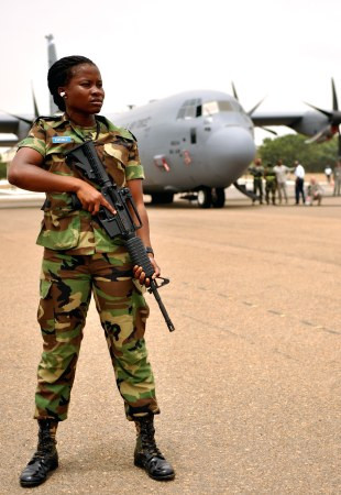 Giới chức ở nước Tổng thống Obama đến năm sẽ phải gia tăng bảo vệ an ninh trên mặt đất. Trong ảnh là Đại úy Lydia Opoku, thuộc Không quân Mỹ, đang canh gác cạnh chiếc máy bay vận tại C-130J Hercules trên trường bay ở Accra, Ghana, trong một đợt huấn luyện vào tháng 3/2008