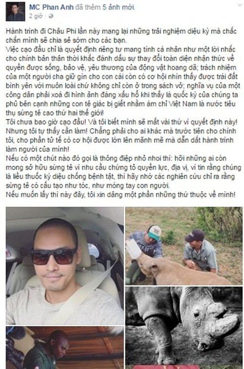 Được biết, MC Vietnam Idol quyết định xuống tóc sau khi đến Châu Phi cách đây một tuần. Chuyến đi giúp MC Phan Anh có cơ hội tiếp xúc với những loài động vật hoang dã đang đứng trước nguy cơ tuyệt chủng, chính vì thế, anh muốn thể hiện sự xót xa của mình bằng hành động.