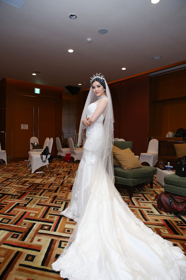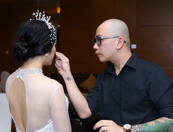 Nàng kiều nữ bất ngờ mặc váy cưới trắng muốt, khoe lưng trần gợi cảm của nhà thiết kế Minh Lộc. Cô được chăm chút kỹ lưỡng trong hậu trường trước khi lên sân khấu.