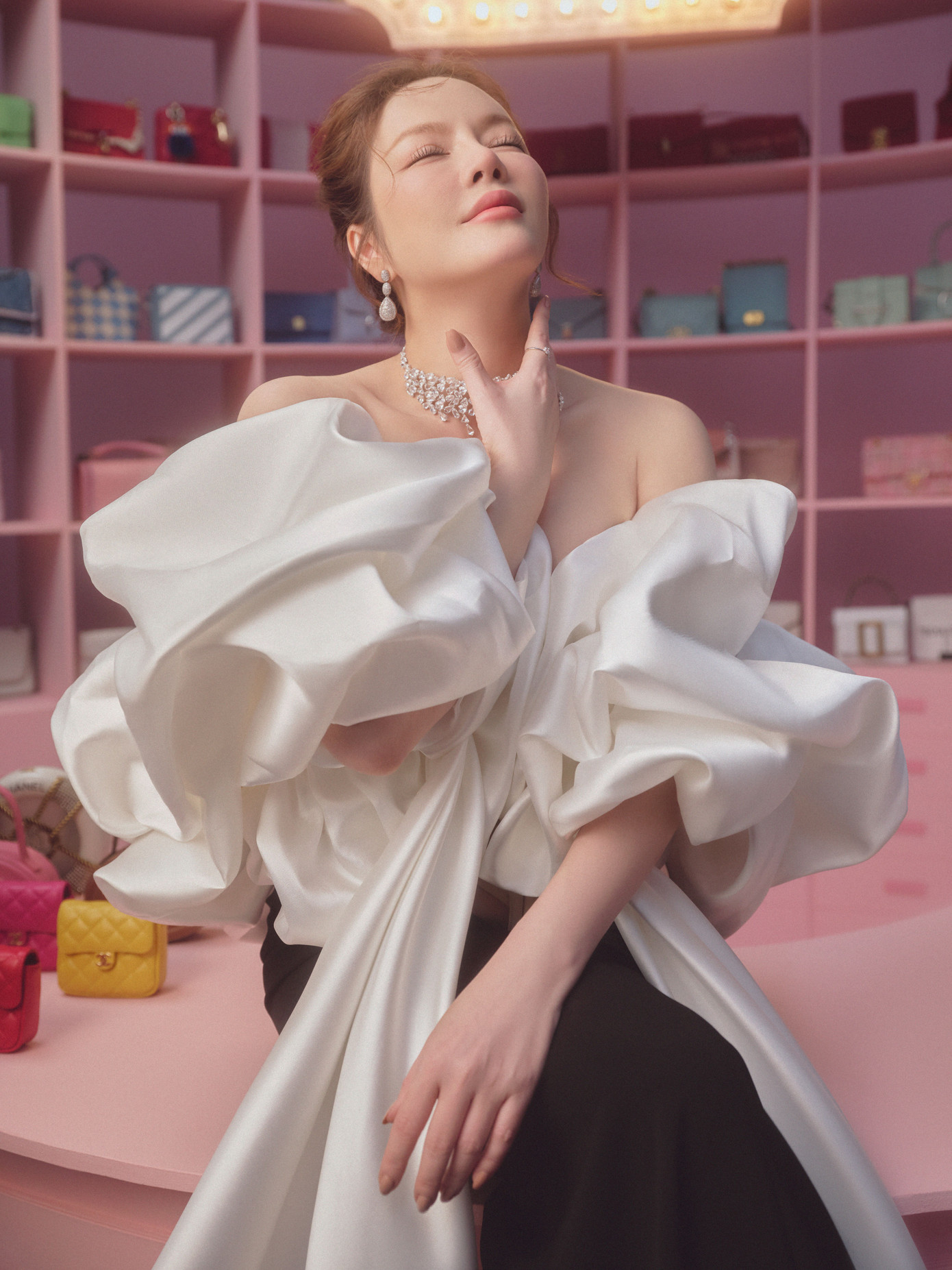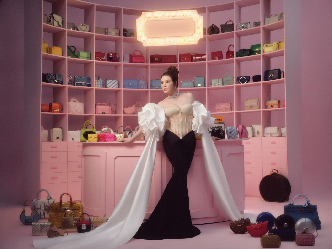 "Chị đại kim cương" sở hữu bộ sưu tập túi, giày, quần áo, phụ kiện đắt đỏ chẳng thua ai. "Nói có sách mách có chứng", Lý Nhã Kỳ vừa hé lộ "sương sương" một góc tủ túi cả trăm chiếc màu sắc và kiểu dáng, khiến ai trông thấy cũng phải choáng ngợp. Cô set up một chiếc kệ hồng "khủng" bài trí những chiếc túi hiệu, nhìn qua cũng đủ biết tổng giá trị "không phải dạng vừa đâu".