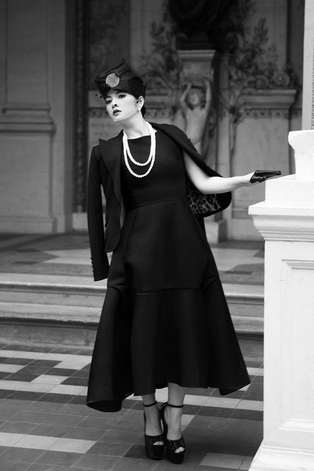 Diện set đồ đen, từ chiếc đầm Toni Maticevski đến áo vest khoác ngoài, mũ ren Celine Robert, găng tay Maison Fabre và clutch Marchesa, cô sử dụng duy nhất chuỗi ngọc trai trắng làm điểm nhấn.