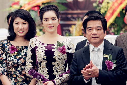 | Trong tà áo dài màu tím với những đường ren kết duyên dáng hai bên tay hạ xuống eo của nhà thiết kế Võ Việt Chung, Lý Nhã Kỳ trở nên nền nã. |