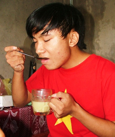 Đau đớn khiến Khiêm không thể nuốt nỗi dù chỉ là một hạt cơm vào miệng, thức ăn hàng ngày của em được mẹ nấu riêng, đó là một bát cháo gạo được ngâm rồi nấu, xay thật nhuyễn em mới có thể nuốt được, còn mỗi khi uống nước, em phải dùng đến ống hút.