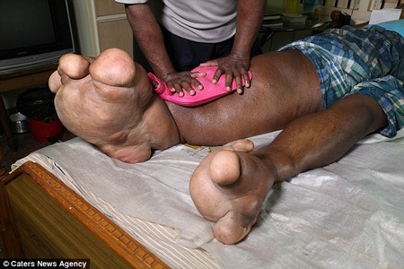 Arun Rajasingh, 34 tuổi, sống tại thành phố Chennai (Ấn Độ) mắc phải một chứng rối loạn di truyền kỳ lạ ngay từ khi sinh ra, khiến cơ thể của anh phát triển không bình thường, đặc biệt đôi chân của Arun liên tục phát triển về kích cỡ không ngừng và căng phồng như trái bóng. Hiện tại, chân phải của Arun đã có khối lượng lên đến 100kg.