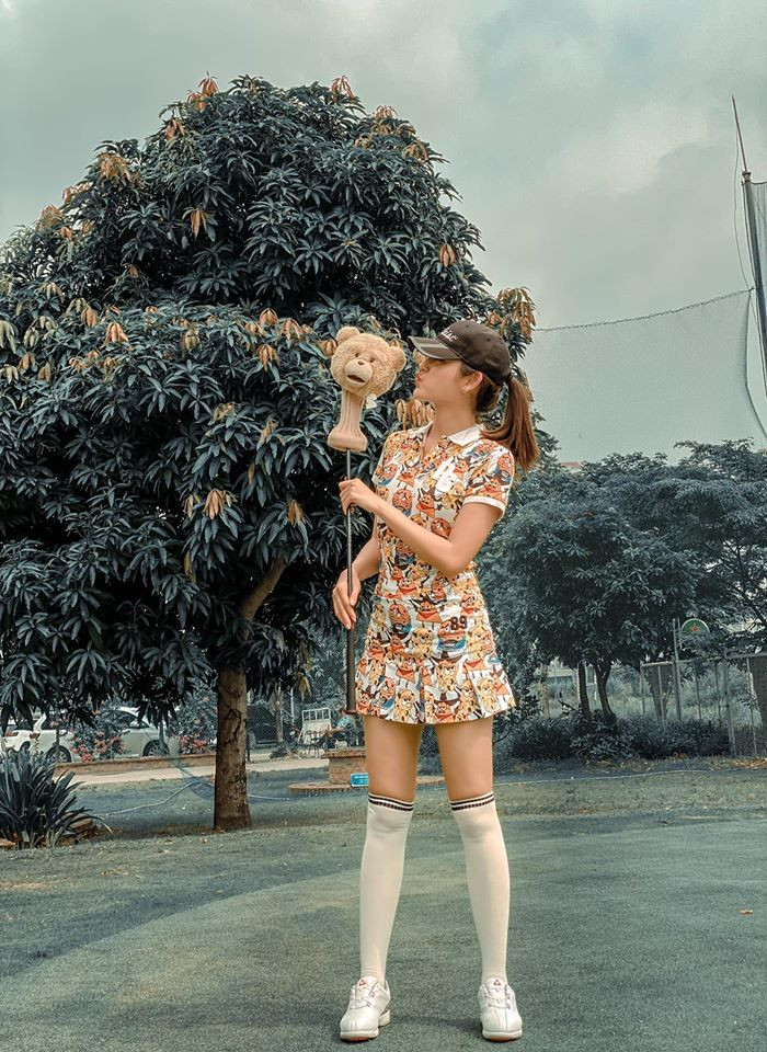 Á hậu Huyền My làm quen với bộ môn golf. Người đẹp diện bộ váy hoạ tiết cực đáng yêu.