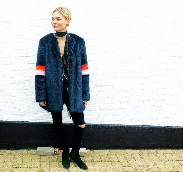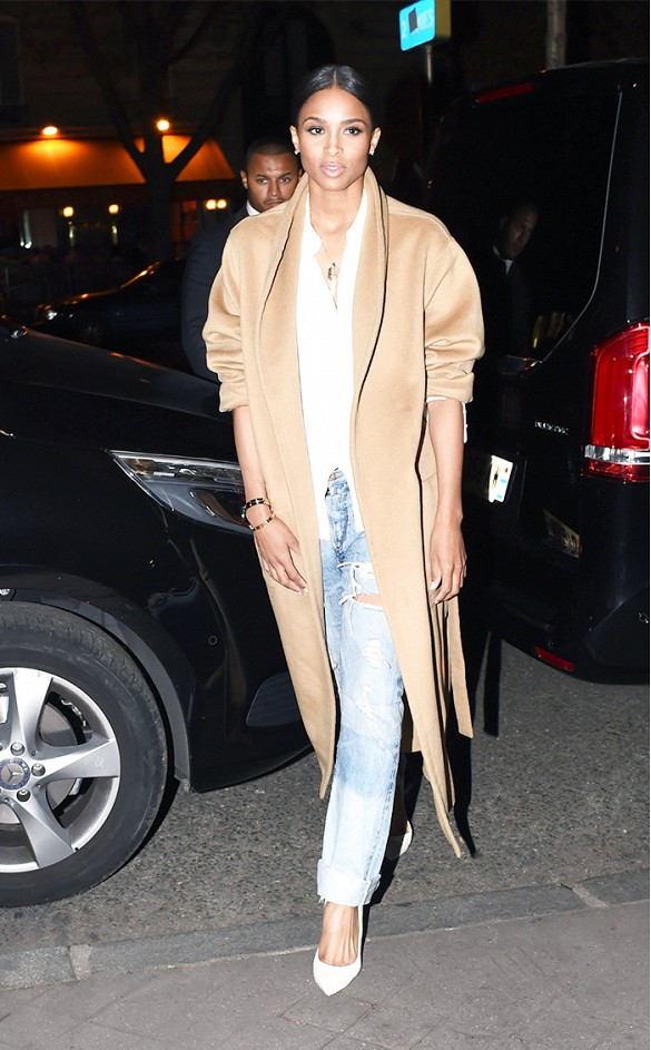 Ca sỹ Ciara cũng thích mặc áo khoác dài (Max Mara) đi cùng quần Jeans rách).