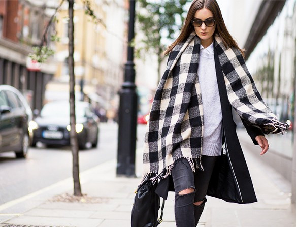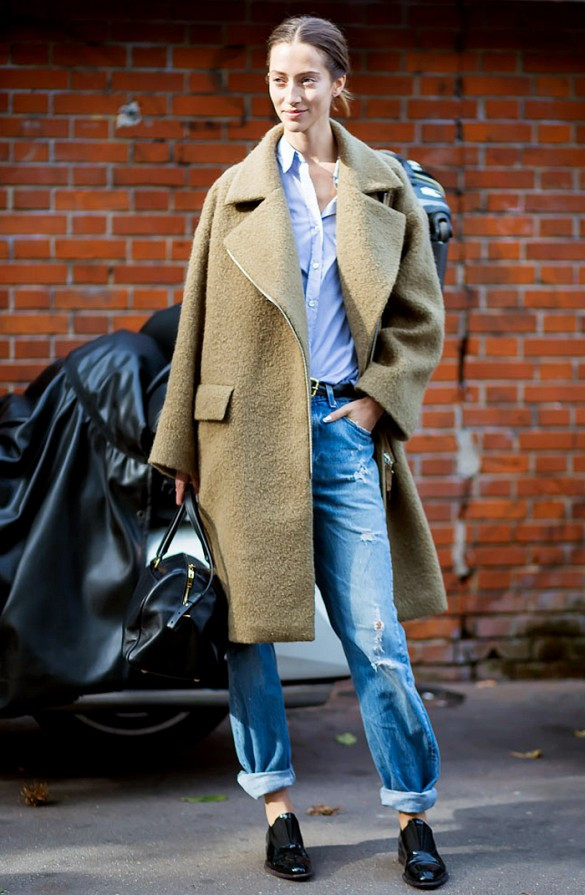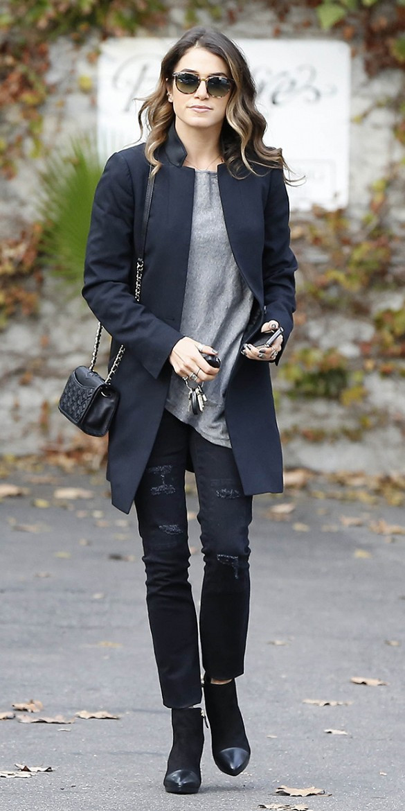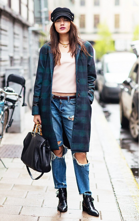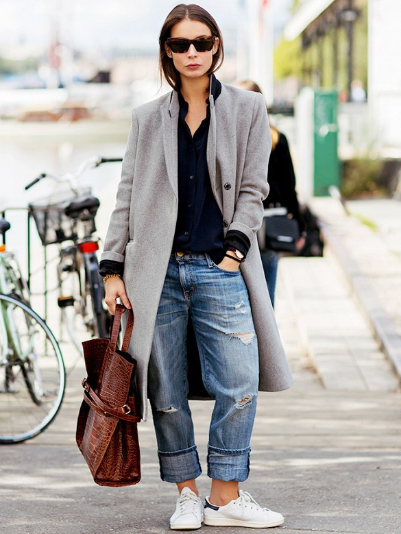 Áo dạ và quần jeans rách gối cho vẻ đẹp năng động và tự do.