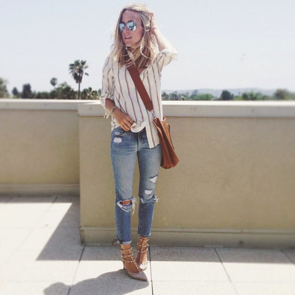Quần Jeans rách "sang trọng" hơn khi kết hợp với giày cao gót Valentino.
