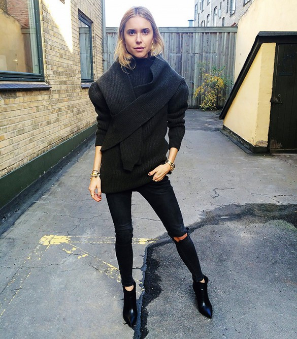 Áo len rộng đi kèm quần jeans rách và một đôi giày đỏ nổi bật - bạn là cô nàng cá tính và thời trang nhất!