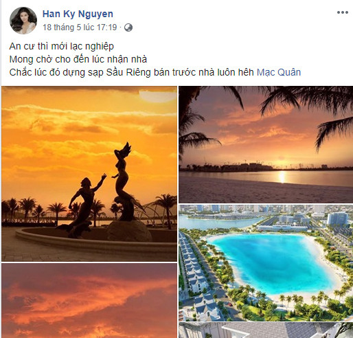 Cô viết "An cư thì mới lạc nghiệp. Mong chờ cho đến lúc nhận nhà, chắc lúc đó dựng sạp sầu riêng bán trước nhà luôn..." và đính kèm những hình ảnh phối cảnh nhà mới cùng với khuôn viên xung quanh.
