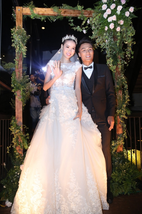 Mạc Hồng Quân nhanh chóng cầm đuôi váy cưới giúp vợ.