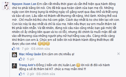 “Em cần rất nhiều thời gian và cần thể hiện qua hành động chứ không phải bằng lời nói. Chị đã trải qua hoàn cảnh của bạn mẹ (Ly Kute-pv) rồi. Những ngày con lớn trong bụng là những ngày cố gắng vượt qua đau khổ và thất vọng và bảo vệ con. Lâu dần nó thành vết thương rất nặng, khó lành. Không thể xoá mờ. Chỉ muốn trả thù cho hả cơn giận. Cách duy nhất là không cho liên lạc với con. Con lúc này là duy nhất và chỉ là của mẹ. Nên nếu thực sự em muốn thăm bé thì phải kiên nhẫn. Và tất nhiên, đừng nói câu nào cũng nhắc bạn gái mới( tất nhiên cô ấy chẳng liên quan và không có lỗi), nhưng đó chính là muối mặn để xát vào vết thương của những người phụ nữ hụt hẫng sau yêu. Càng nhắc càng khó thăm con em à. Chúc em sẽ biến lời nói thành hành động thiết thực để được yêu con nhé”- Xuân Lan viết.