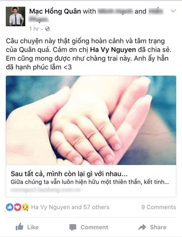 Không còn nghi ngờ gì nữa, câu chuyện trên hoàn toàn trùng khớp với những ồn ào đời tư của Mạc Hồng Quân trong thời gian qua. Nếu không có đoạn kết thì nhiều người lầm tưởng Mạc Hồng Quân đang “thuê người” viết chuyện cho mình. Chàng trai trong câu chuyện được người con gái đồng ý được chăm sóc con còn Mạc Hồng Quân thì vẫn bị Ly Kute từ mặt, kiên quyết không cho gặp con.