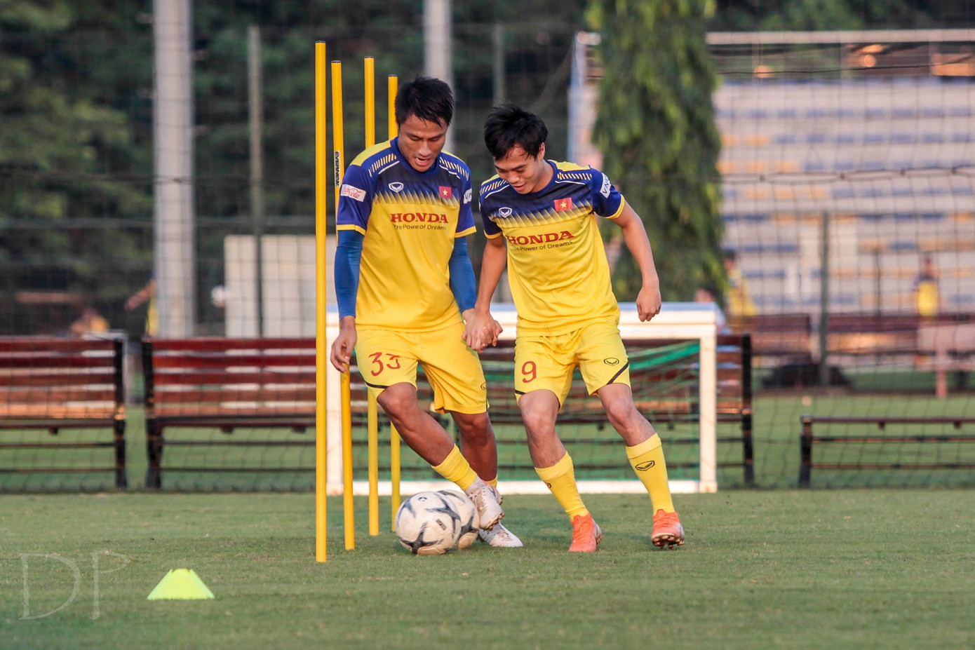 Mạc Hồng Quân và Văn Toàn 'nắm tay nhau thật chặt, giữ tay nhau thật lâu' trong bài tập dẫn bóng vượt qua chướng ngại vật.