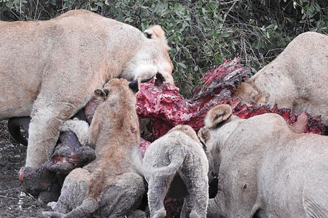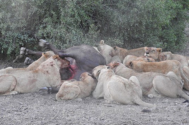 Không lâu sau, chú trâu rừng chỉ còn lại bộ xương, bởi bầy sư tử quá đông và chúng đều đang rất đói.