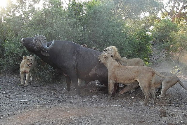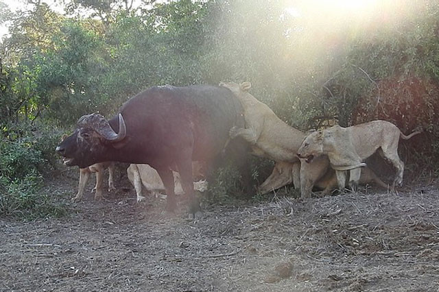 Với số lượng đông đảo và màn phối hợp ăn ý, những con sư tử đã dễ dàng tóm gọn được một chú trâu rừng ngay cạnh lề đường đi trong Vườn quốc gia Kruger.