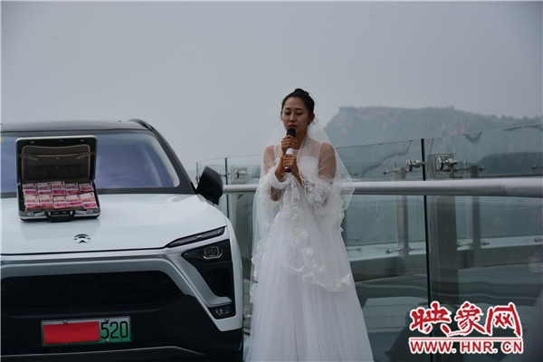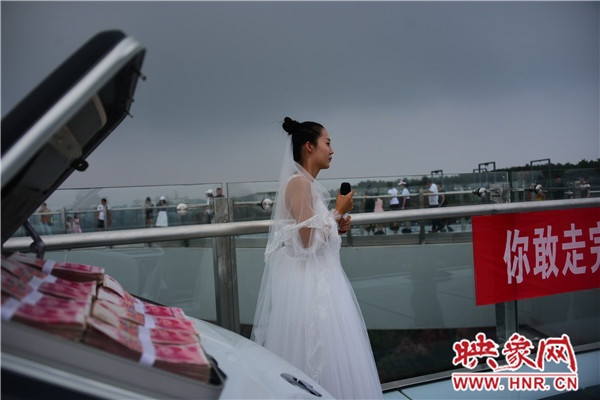 Sự việc xảy ra vào ngày 15/8 vừa qua, tại Fuxi Mountain Skywalk - một trong những cầu kính đáng sợ nhất thế giới, tọa lạc ở thành phố Trịnh Châu (Hà Nam, Trung Quốc). Lúc đó, trên cầu xuất hiện một cô gái mặc váy cưới, cùng một siêu xe và vali chứa khá nhiều tiền. Mục đích của cô nàng là thử thách người bạn trai vốn mắc chứng sợ độ cao của mình.