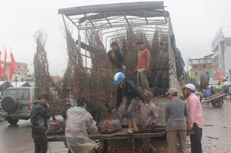 Trong ngày 30/1, rất nhiều phương tiện chở cây cảnh từ các nơi đã cấp tập đổ về Quảng Trị. Dù trời mưa, lạnh nhưng không khí mua hoa, cây cảnh đã trở nên khá nhộn nhịp. Những bông mai, đào khoe sắc đã góp phần mang hương Xuân đến sớm với vùng đất này.