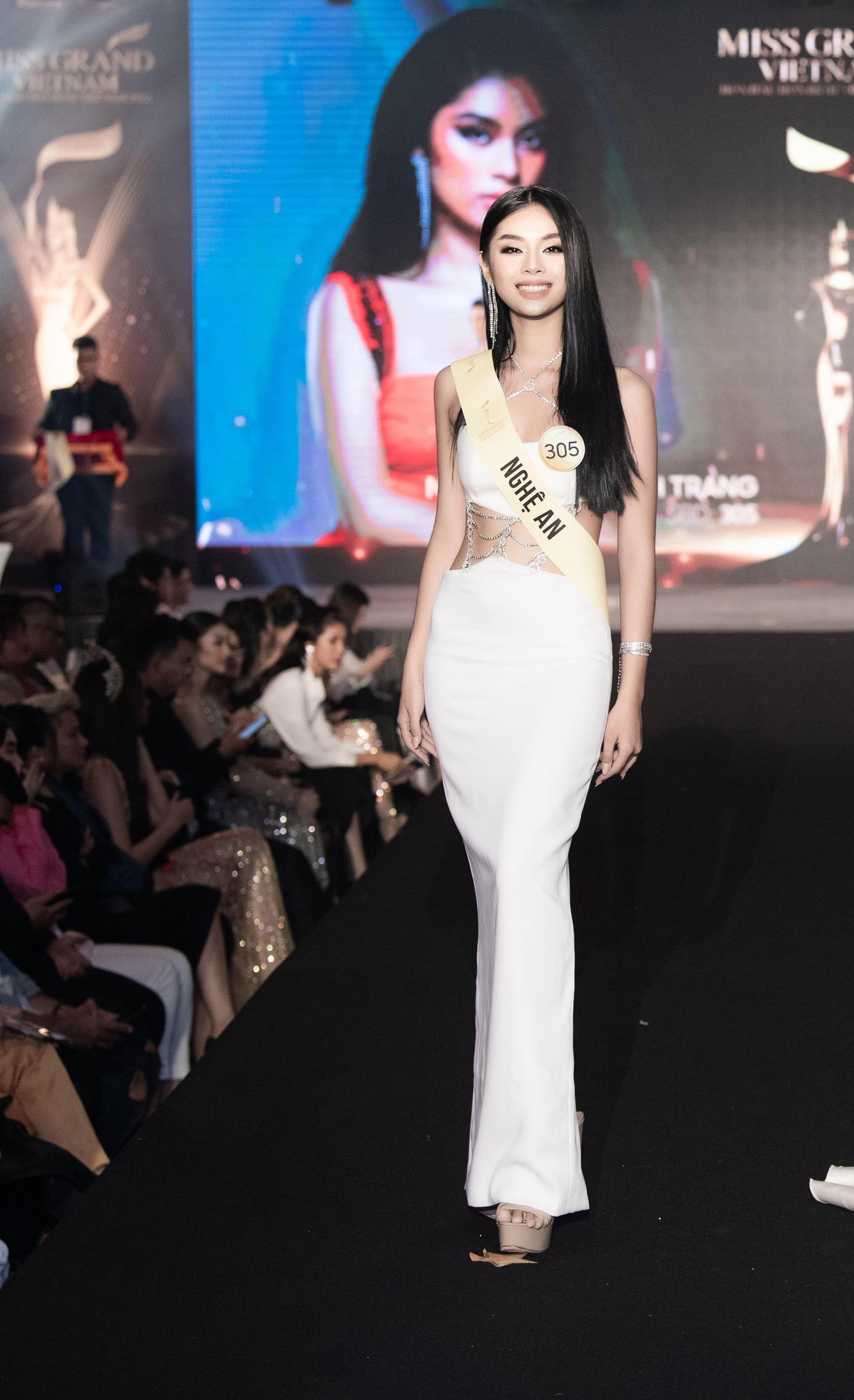 | Ban tổ chức cũng dựng một sàn catwalk dài để các thí sinh có thể trình diễn sau khi nhận sash. Chế Nguyễn Quỳnh Châu diện váy lụa màu xanh với những đường cut-out táo bạo, sải bước đầy tự tin. |