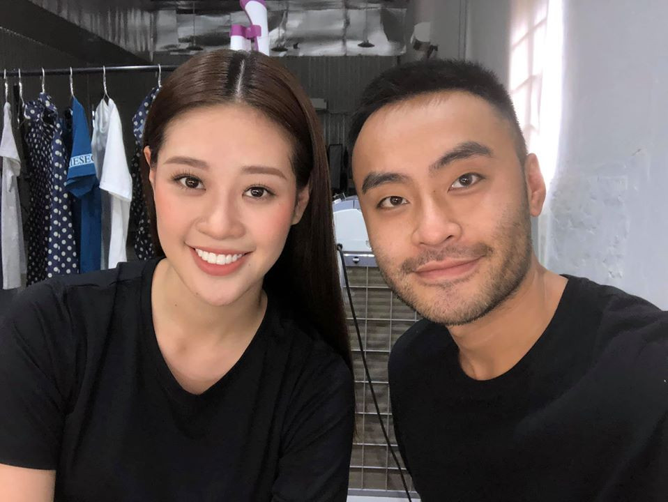 Hoa hậu Khánh Vân tươi tắn cùng MC Dustin Nguyễn trong hậu trường ghi hình.