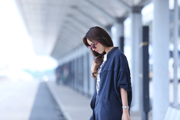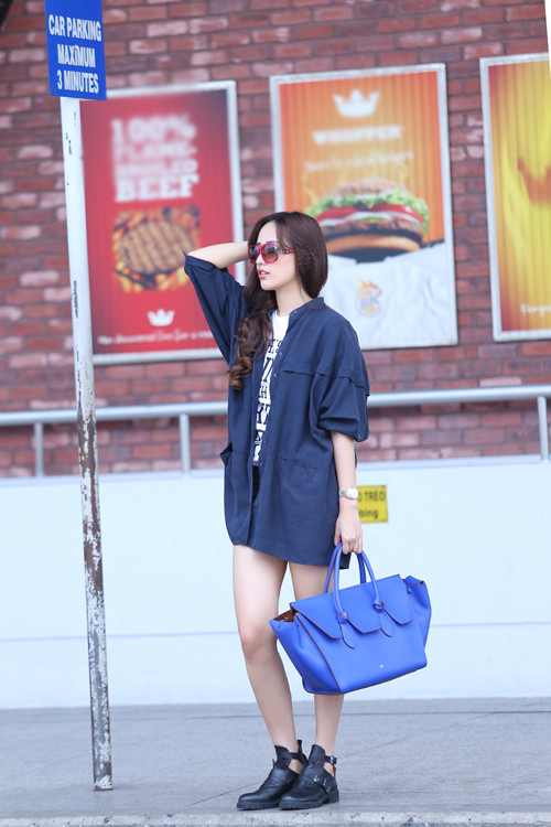 Hoa hậu vẫn trung thành với phong cách trẻ trung ngoài đời thường khi diện áo thun, quần short và áo khoác mỏng. Cô còn khoác túi xách hàng hiệu, đeo kính đắt tiền.