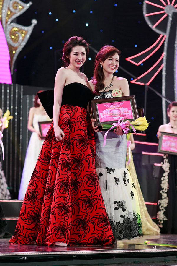 Hai người đẹp rạng rỡ trên sân khấu khi trao giải cho các thí sinh thắng cuộc.