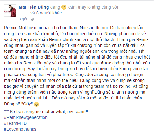 Tuy nhiên, mới đây những người hâm mộ team Mai Tiến Dũng đã khá lo lắng khi đọc được những chia sẻ của Mai Tiến Dũng trên trang cá nhân của anh. Không những chia sẻ về những kỉ niệm của nhau, giọng ca hải ngoại còn động viên, "xin hãy để lại những điều không vui ở lại phía sau và cùng tiến về phía trước".
