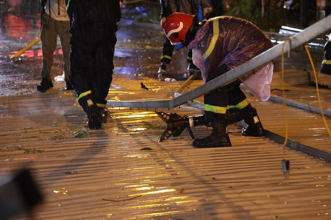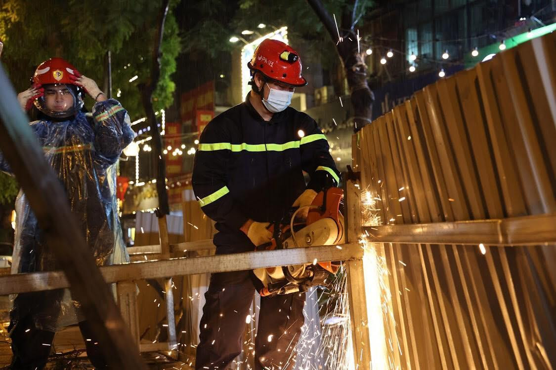 Lực lượng Cảnh sát phòng cháy, chữa cháy và cứu nạn cứu hộ Công an quận Hoàn Kiếm cũng điều động 2 xe chuyên dụng cùng nhiều cán bộ chiến sĩ tới hiện trường phối hợp với công an phường và người dân hỗ trợ triển khai tháo dỡ, cắt mái tôn di chuyển đi nơi khác.