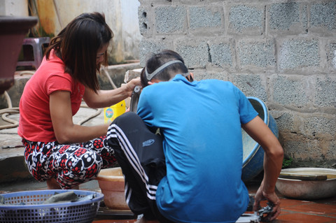 Trình và vợ tiến hành vệ sinh các bộ phận xe cần sơn.