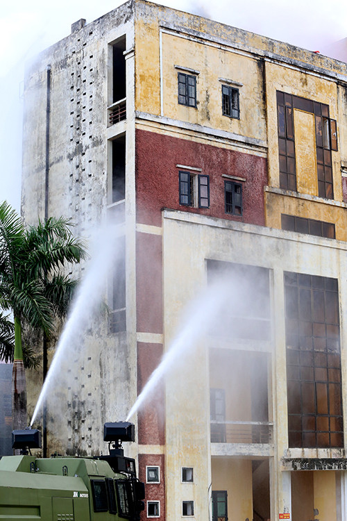 Trong lúc này, một tốp cảnh sát khác dùng gậy để leo lên tầng 3, nơi con tin đang bị giam giữ.