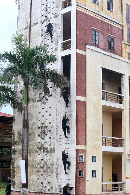 Tiếp cận từ bên hông tòa nhà, hàng chục lính đặc nhiệm leo dây lên các tầng.