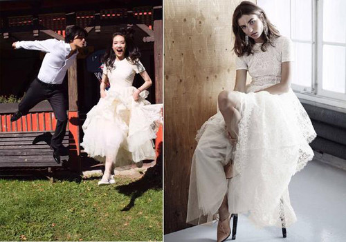 Thư Kỳ hé lộ trên Sina bộ ảnh cưới cũng được thực hiện ở Prague. "Váy cưới là bộ đồ hãng H&M tặng tôi cách đây hai năm. Khăn voan cài đầu được chọn qua loa ở một cửa tiệm. Bộ đồ Tây của Đức Luân và chiếc váy hồng tôi mặc được mua hai ngày trước khi chụp". Ảnh cưới thực hiện với phong cách tự nhiên, tươi trẻ.